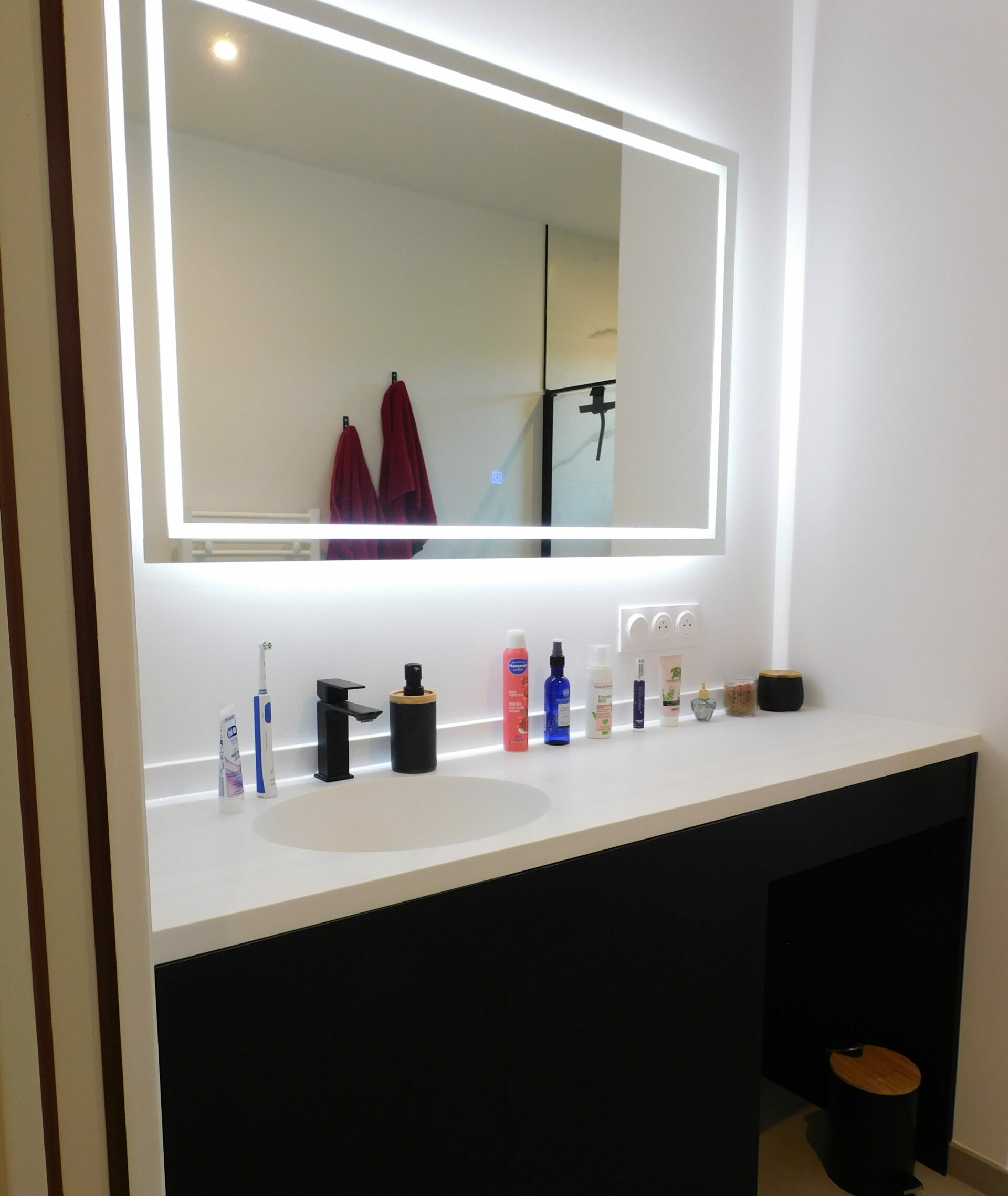 Ici, nous avons collaboré avec le Constructeur de Maison Individuel en charge de la construction de la villa des clients. Notamment la partie technique : plan électrique, plan de cloisons, choix des matériaux, appareillages… à 4 mains 😉