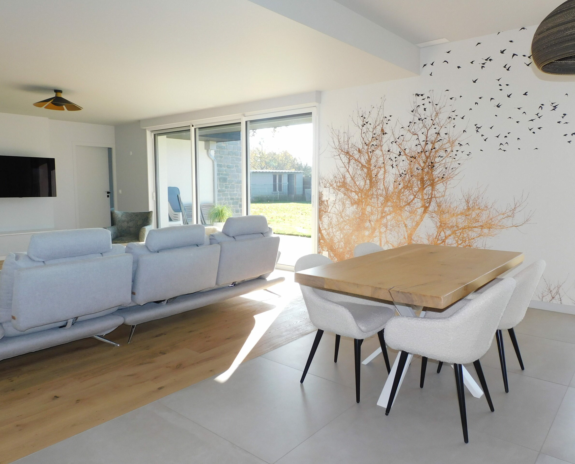 Retranscrire et combiner leurs deux personnalités pour repenser et co-créer leur maison, à l’atmosphère contemporaine, chaleureuse et fonctionnelle. En effet, Monsieur est un véritable amoureux de la nature et amateur de “plumes” (oiseaux, volatiles…) alors que Madame est davantage une fan de “poils” (chien, chats, chevaux).